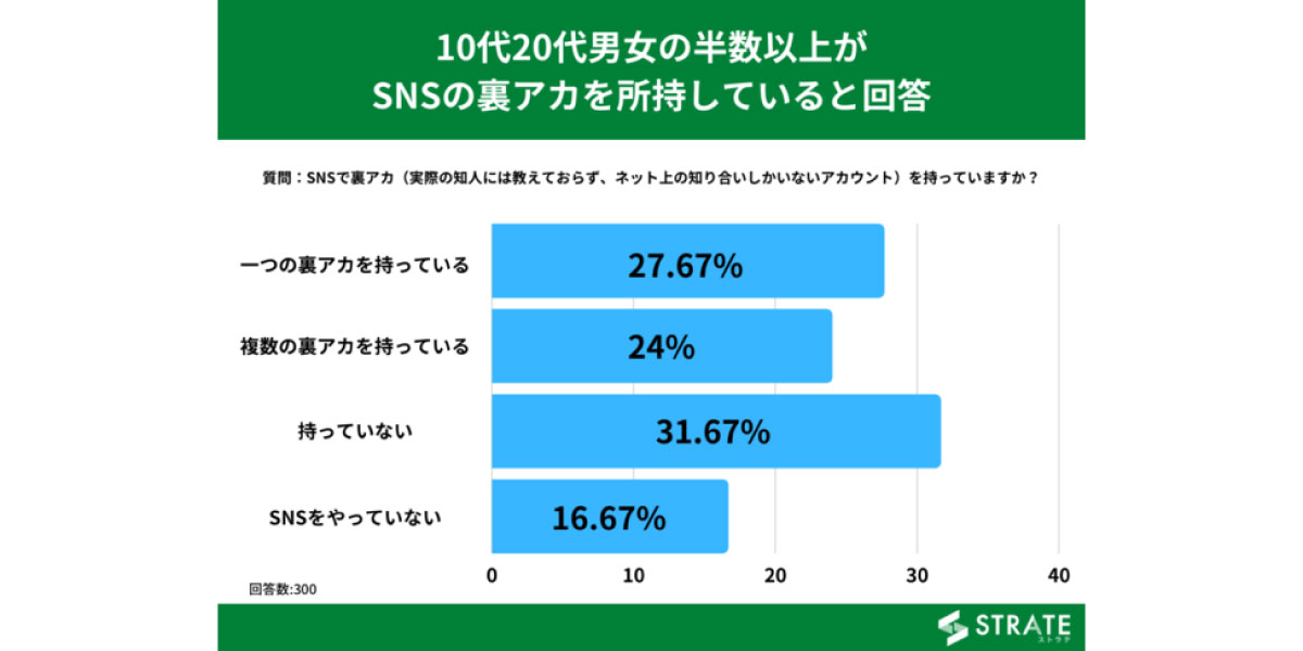 下記の調査結果からデジタルネイティブである10-20代の半数以上が何かしらの裏アカを所持しており、若者にとっては裏アカを所持することは一般的になっています。