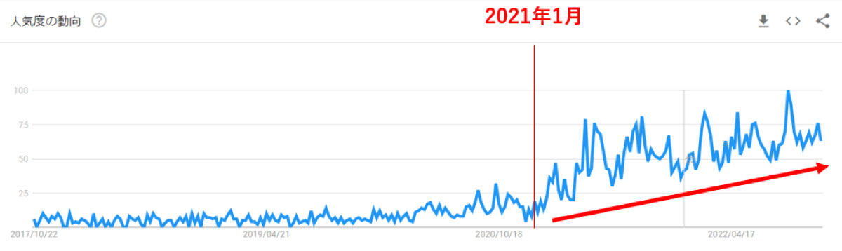 ところで、このような無人のサービスは増えているのでしょうか。Google トレンドで「無人販売」と検索してみると、ここ2年くらいの間で検索数が一気に伸びていることがわかります。