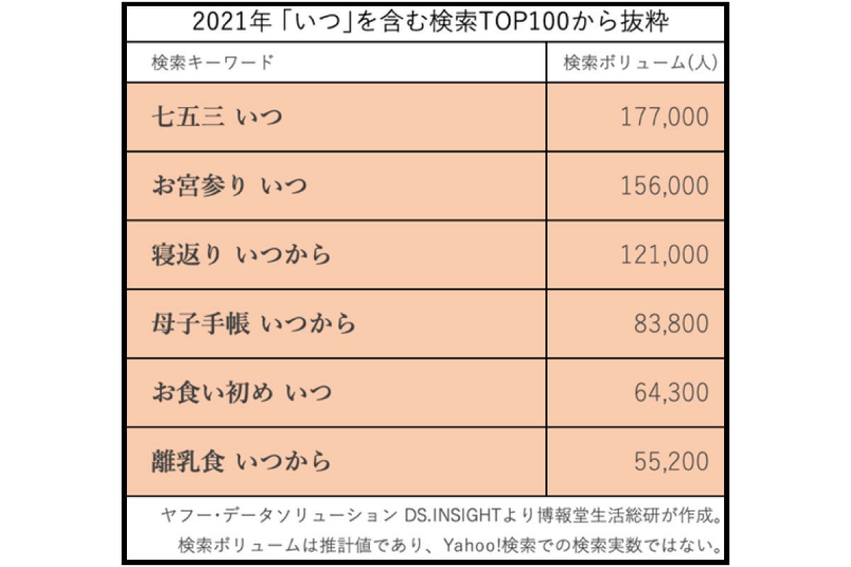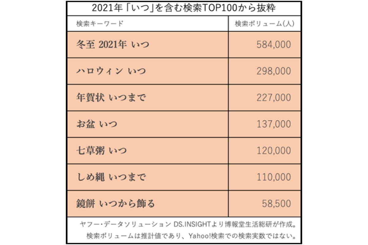 ヤフー株式会社が提供するデータ分析ツール「DS.INSIGHT」を使って、2021年1年間の検索データの中から、「いつ」を含む検索の上位100位を抽出。気になるものをピックアップしてご紹介していきます。