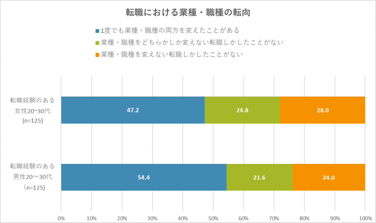 ここ数年、転職は一般化してきていますが、まずは転職の「質」に注目してみましょう。通常の考え方ですと、”今までの経験を生かした転職”を志向するのが一般的ではないかと思います。しかしながら、この世代の特徴を見ると、業種も職種も両方を変える「ジャンプ転職」がマジョリティーです。今回独自に実施した調査(※1)では、20代30代転職経験者の半数が業種も職種も両方変える転職をしたことがあると回答。女性20~30代では47.2%、男性20~30代では54.4%と、いずれも約半数が「ジャンプ転職」の経験があることが分かりました。