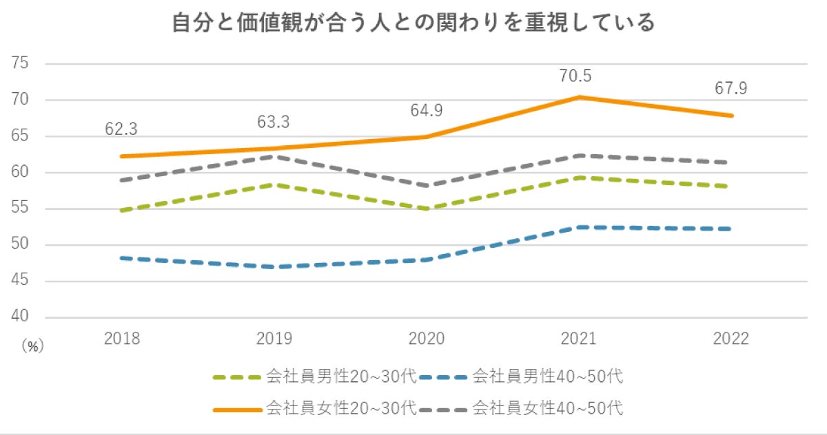 20-30代女性は、他の世代と比較しても、「自分と価値観のあう人との関わり」を重視。