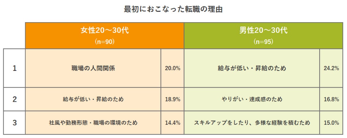 ジャンプ転職をしたことがある20~30代女性の1回目(=最初の転職時の転職理由)を見てみても、1位が「職場の人間関係」(約30%)と、人間関係を理由として転職を行っている人が最も多い結果に。