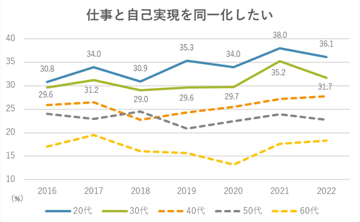 20-30代の若者は、ほかの世代と比べ、「仕事と自己実現を同一化したい」と答える人の割合が高く、”仕事は仕事、人生は人生”と別々に捉えていない人が多いことがうかがえます。