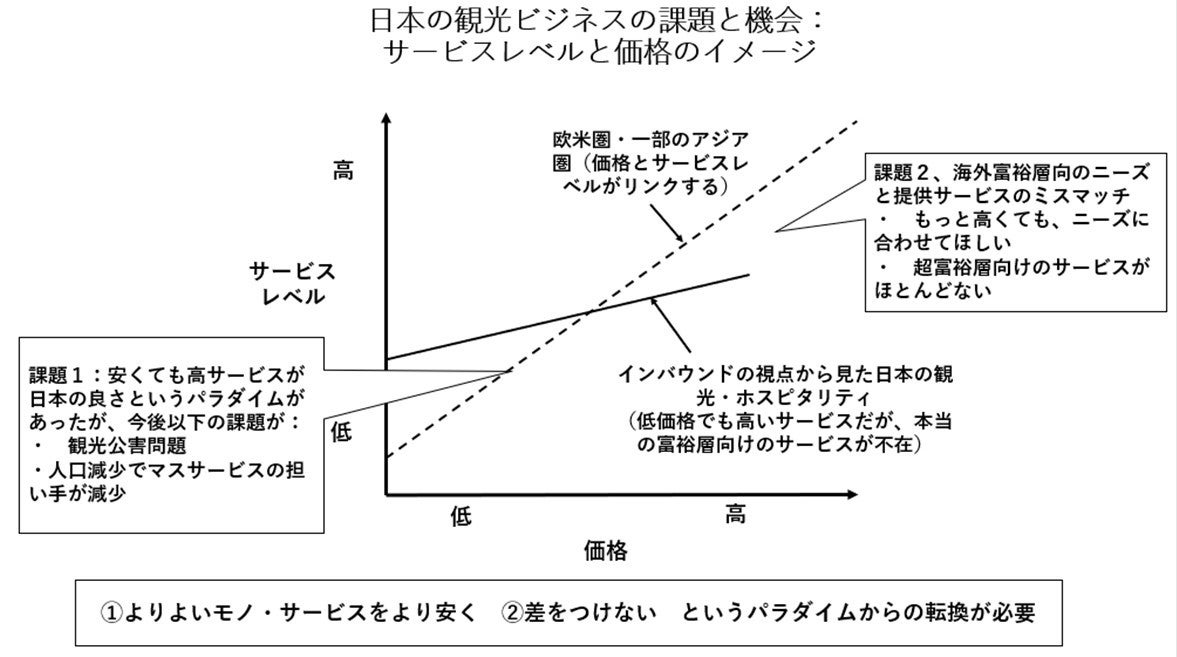 まず、僕は拙著『インバウンド・ルネッサンス』で、日本はもっとインバウンドビジネスを活用し、それを都市部だけではなく地方圏に展開し、かつ観光と非観光事業者を連携させるべきだと説いています。さらに、モノにしろ情報にしろ、海外から入ってくるものと海外へ送り出すもの、つまりインバウンドとアウトバウンドをループさせることが非常に重要になる。この4つに加えて、現状の価格と価値に関するパラダイム変革によって日本は持続的に発展が可能になると思います。これまでの日本は、いいサービスや製品をより安く提供することが良しとされてきましたが、そうではなく「いいものをより高く」というパラダイムに変えるんです。近隣エリア同士、複数企業が連携し、いわゆる体験価値のような、モノとサービスとプロセスが一体化した形での価値を共創していくべきだと考えています。
