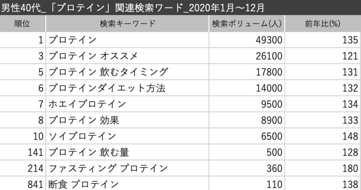 ヤフー株式会社が提供するデータ分析ツール「DS.INSIGHT」を使って、40代男性の「プロテイン」を含む検索について、コロナ禍に入る前の2019年と、入った直後の2020 年を比較してみました。