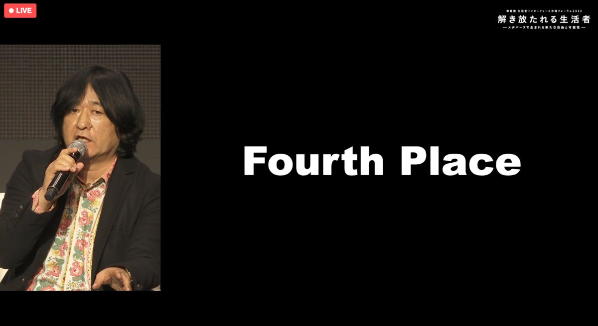 嶋野 :私は「Fourth Place」と書かせていただきました。サードプレイスという言い方が少し前に流行りましたが、1番目の場所である家庭があって、2番目の場所である会社や学校があって、3番目にお気に入りのカフェのような場所があるといいよという話でしたよね、まさにメタバースは、サードプレイスの次に来るフォースプレイス、4番目の場所なんじゃないでしょうか。家庭や会社、学校のしがらみにとらわれないサードプレイスよりもっと、物理法則にも性別や年齢といったリアルな属性にもとらわれない新たな場所。そのなかでリラックスしたり楽しんだり、自己実現をはかったり、そういう4番目の選択肢を作ることができれば、生活者をエンパワーメントするためにうってつけの場所にできるのではないかと思っています。