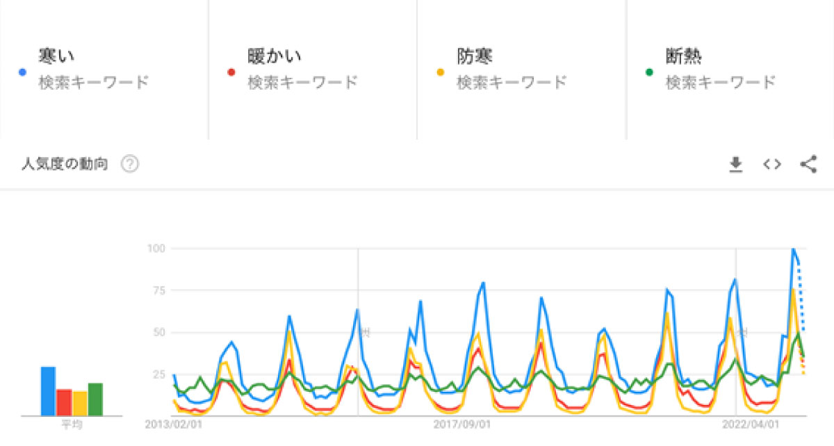 そんなはずはないだろう!と思いながら、Googleトレンドで「寒い」を検索してみると、当然のごとく毎年冬にスパイクしていますが、2020年からその規模がだんだんと大きくなり、今年はより一層大きくなっていることがわかります。「寒い」実感している人が増えていることのあらわれでしょうか。