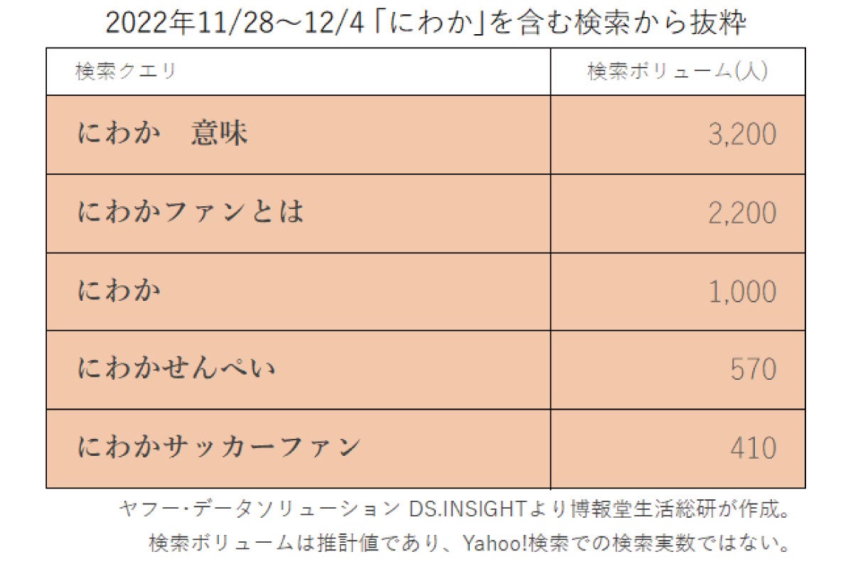 ヤフー株式会社が提供するデータ分析ツール「DS.INSIGHT」を使って、「にわか」を含む検索クエリの動向を探ってみました。するとやはり、ワールドカップの日本代表戦が盛り上がっていた11月21日週~12月5日週の期間は多くのクエリで検索ボリュームが通常の3倍以上に増加していました。