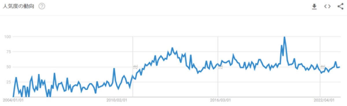 最もグラフが高い位置にあるのは、2019年の12月。その直前の10月にも、少し大きい山があります。共通するのはラグビーのワールドカップ。2015年に強豪・南アフリカを下して一躍話題となり、2019年の戦いぶりにも注目が集まりました。10月には南アフリカ戦、12月にはパレードが行われています。「にわか」というワードを世間が認識しだしたのは、ラグビーワールドカップでの日本代表の活躍のタイミングと言って差し支えないのではないでしょうか。 ちなみに、Google Trendで2004年からの動向を調べても、この時期に一気に注目が集まったことが分かります。