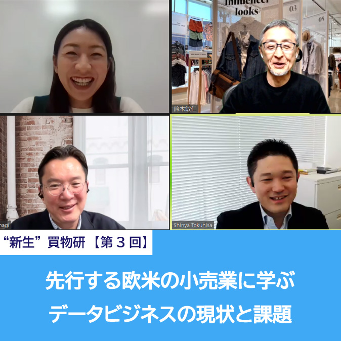 “新生”買物研【第4回】は、第3回に続いて流通・小売業の経営コンサルタント矢矧晴彦さんと、米国在住の流通コンサルタント鈴木敏仁さんをお招きし、活況を呈する欧米のリテールメディアの実態や、広告ビジネスの変容、日本におけるビジネスチャンスについて語り合いました。