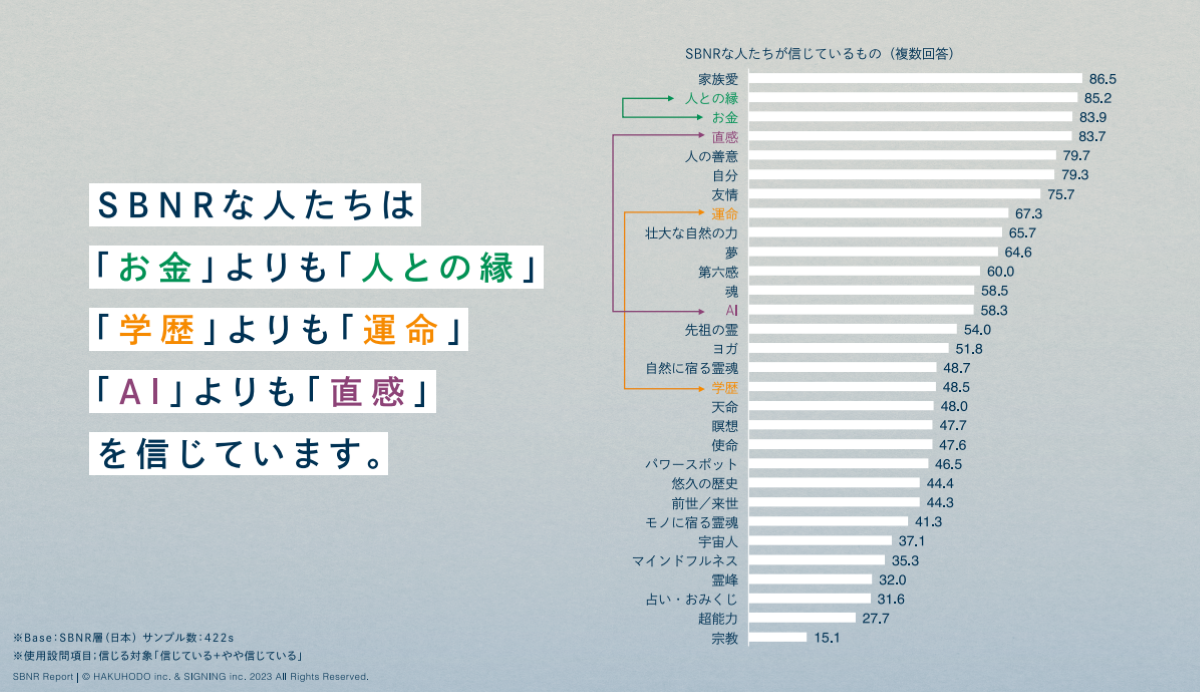 宮島:今回、SBNRプロジェクトでは、日本を含めた4カ国の方々を調査しているのですが、SBNRな人たちは、「お金」よりも「人との縁」、「学歴」よりも「運命」、「AI」よりも「直感」を信じているといった調査結果が出ています。ある種合理性と逆行するような部分もある調査結果ですが、長嶋さんはこのデータをどのようにご覧になりますか?