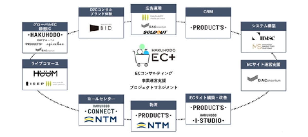 HAKUHODO EC+は、博報堂DYグループ内のEC領域のナレッジやスキルを集結し、クライアント企業のEC事業を戦略構築から実装・運用までフルファネル、ワンストップでサポートする一大プロジェクトとして、2021年に発足した。