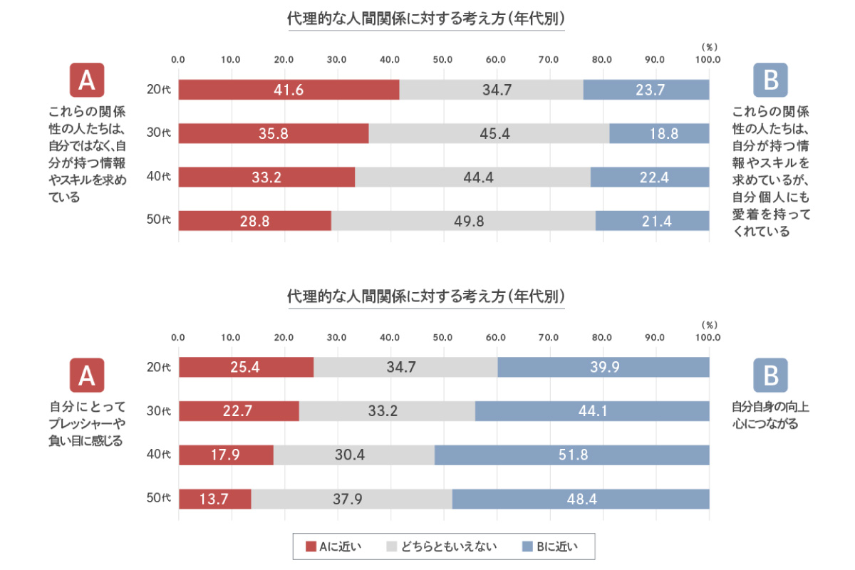 代理的関係性には、必ずしもお互いの人格ではなく、お互いの持つ“機能”を求め合うドライな側面があり、そのことがときにもたらす緊張感や疎外感を20代Z世代が感じている様子も伺えます。