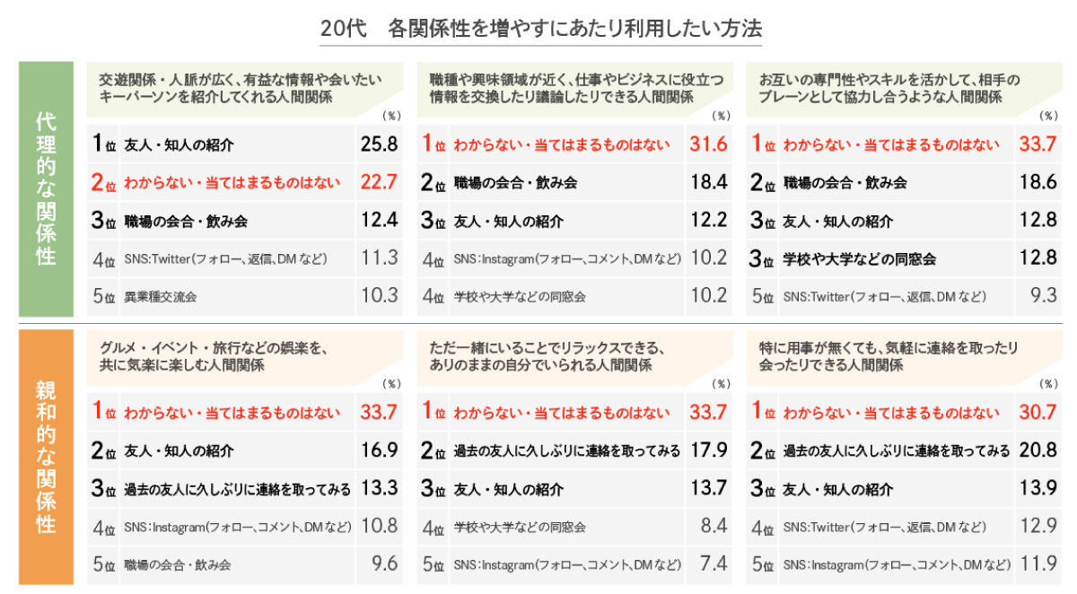 代理的関係性では「職場の会合」が、親和的関係性では「友人・知人の紹介」「過去の友人に連絡を取る」がそれぞれ高くなっていますが、注目したいのは、いずれの関係性も作り方は「わからない」が極めて高いことです。関係性へのニーズはあるのに、実際に関係性を作るための具体的な方法はよくわからない状況だといえます。