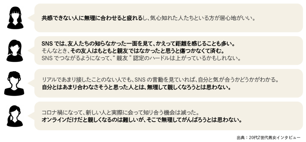 新しく関係性を広げようにも、実際に会えない、相性が合わない場合は事前にそれがわかってしまう。そういった障壁を前に、20代Z世代は、“親しい人が新たに欲しくないわけではないが、無理をしてまでつながろうと思わない”と口をそろえます。