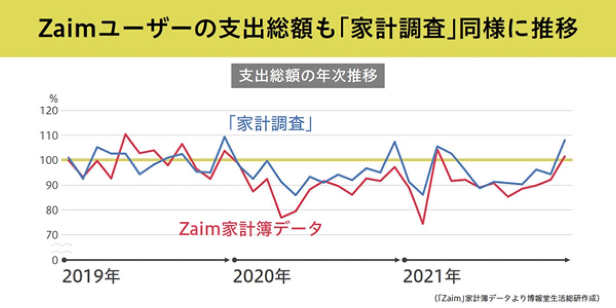 下記のグラフはオンライン家計簿サービス「Zaim」ユーザーの月毎の支出総額について、19年の月平均支出総額を100とした場合の推移を赤で示したものです。青で示しているのは先程紹介した総務省の家計調査における月毎の消費支出金額の推移です。Zaimユーザーの支出総額も、家計調査とほぼ連動した動きをしており、コロナ禍の20年、21年は大きく支出が落ち込む時期が続いていることがわかります。