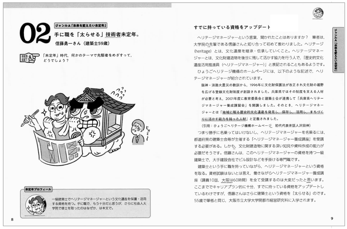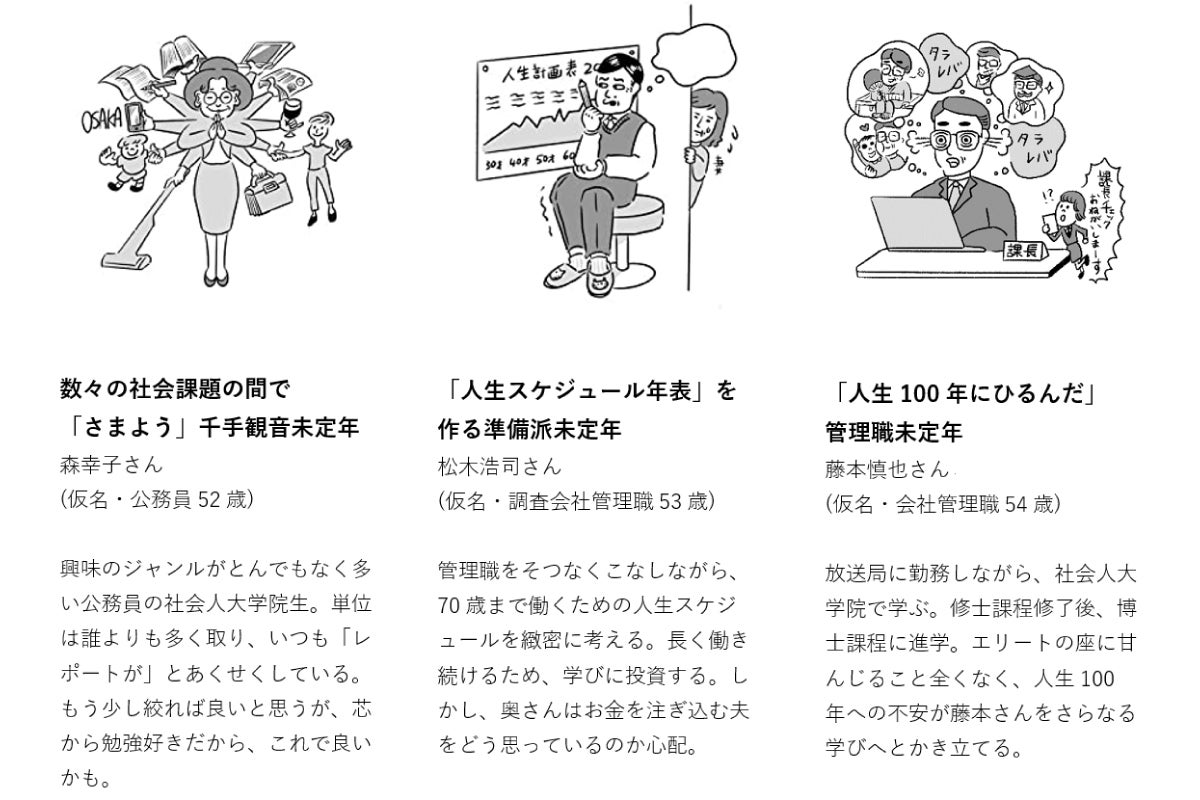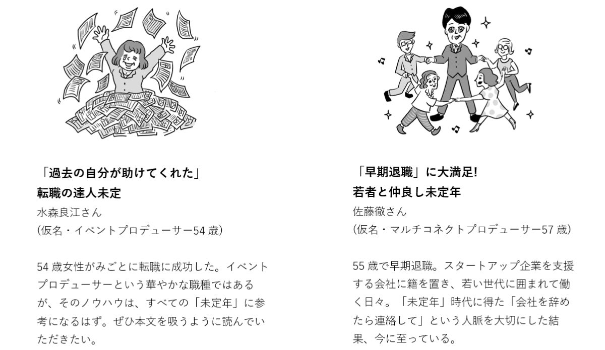 『未定年図鑑』の1つ目の特徴は、未定年のロールモデルを27名取材し、彼らの「未定年アクション」を紐解いていることです。今、未定年の人たちにはロールモデルがいませんから、本書でご紹介する意味は大きいと思っています。たとえば50代で、定年後を視野に入れて自発的に「未定年アクション」を起こしている人や、知らず知らずのうちに行ったことが「未定年アクション」になっている人などが登場します。さらに本書では“ちょっと残念な人”も紹介しており、その失敗例からも何かを学んでいただけるのではないかと思っています。定年対策、リスキリング、学び直しなどが言われる中、具体的に何をしたらいいのかわからないという方に、参考にしていただける一冊となっています。