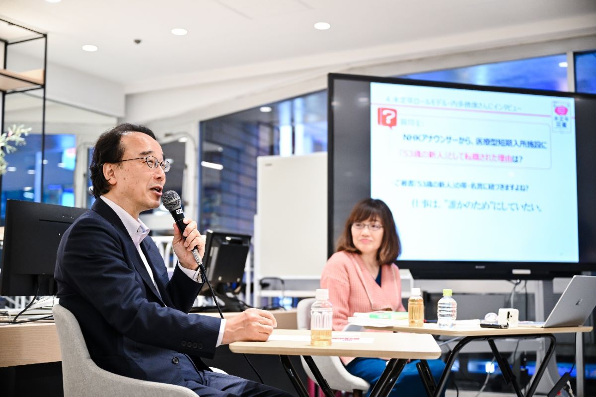ゲストにお越しいただいたのは、本書『未定年図鑑~定年までの生き方コレクション~』にも登場いただいた元NHKアナウンサーの内多勝康さん。内多さんは53歳で早期退職をされて、現在は「国立成育医療研究センター もみじの家」のハウスマネージャーとして活躍されています。私自身は博報堂のクリエイターであると同時にキャリアコンサルタントの資格も取得し、非常勤講師として勤務している大学では学生の就活相談も行っています。