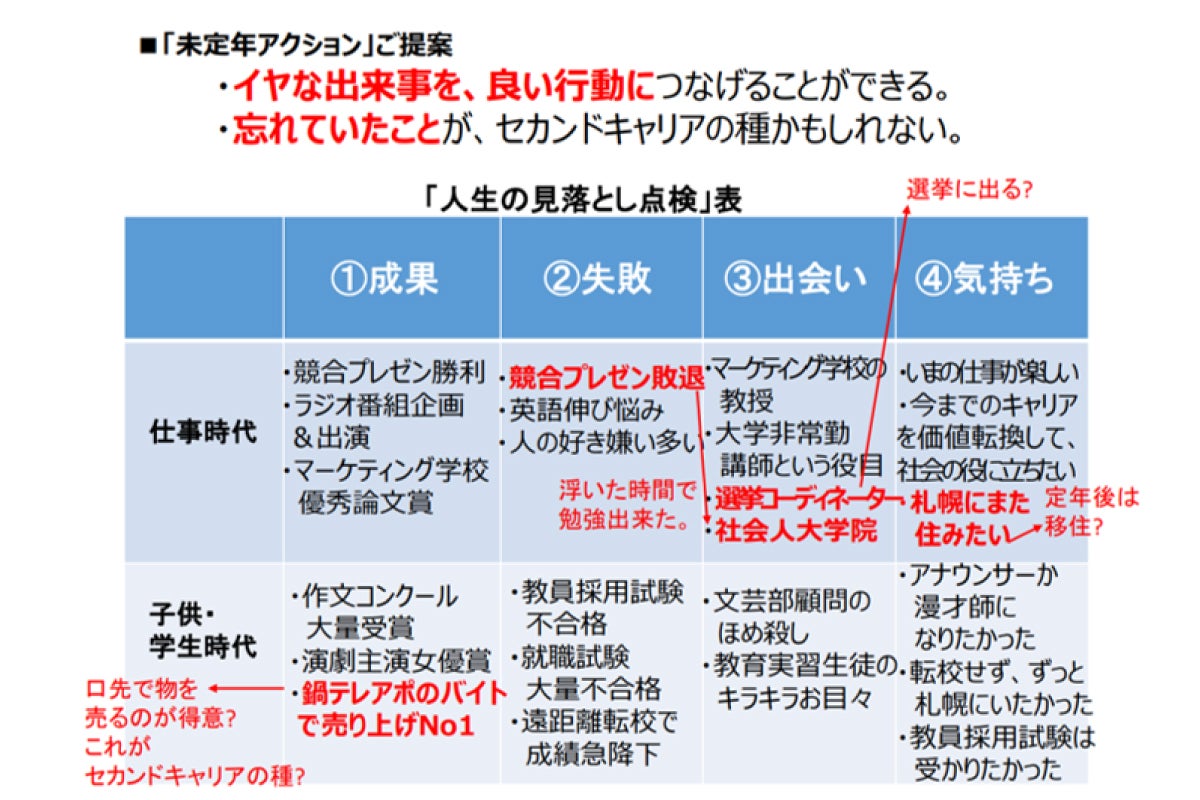 私もやってみたところ、忘れていたことをいくつか思い出しました。たとえば学生時代、鍋の販売営業を電話で行うバイトをしていて、売り上げナンバーワンだったんです。卒業後は正社員になってくれと言われたほどでした。もしかしたらこれがネクストキャリアの種になるかもしれません(笑)。教員採用試験も受けたのですが、今ありがたいことに大学で非常勤講師をやらせてもらえています。講師をやってみようと思えたのはこの経験があったからです。あるいは、競合プレゼンで負け続け非常に辛い時期がありましたが、その時浮いた時間で勉強しようと決意し社会人大学院に通いました。そんな風に書いてるといろいろと思い出していくものです。皆さんもぜひ埋めていってください。過去の嫌だったできごとを良い行動につなげることができたり、セカンドキャリアの種になるような何かを思い出すことができるかもしれません。