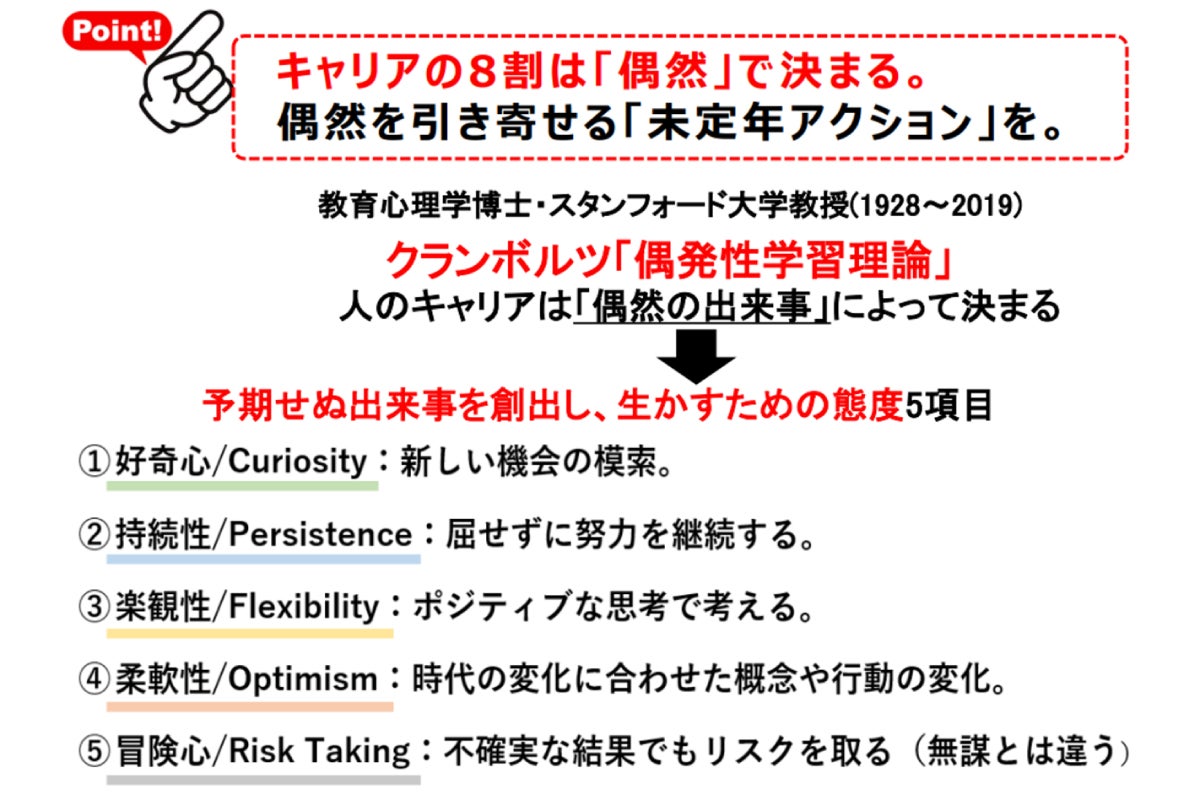 スタンフォード大学の心理学者、ジョン・D・クランボルツ教授が提唱しているキャリア理論に、計画的偶発性理論というものがあります。簡単に説明すると、キャリアの8割は偶然で決まるというもので、偶然を引き寄せることこそが重要であるという考え方です。そして予期せぬ出来事を創出し、活かすために心掛けるべき態度として、好奇心、持続性、楽観性、柔軟性、冒険心の5つが提示しています。ふてくされずに新しい機会を模索し、屈せずに努力を継続する。ポジティブな思考で考える。時代の変化に合わせた概念や行動変化を持ち、不確実でもリスクを取っていく。これらすべてが内多さんに当てはまるような気がしています。偶然というのは口を開けて待っていても起こらないもので、こういう気持ちを持つことで、よい偶然がやってくるのです。