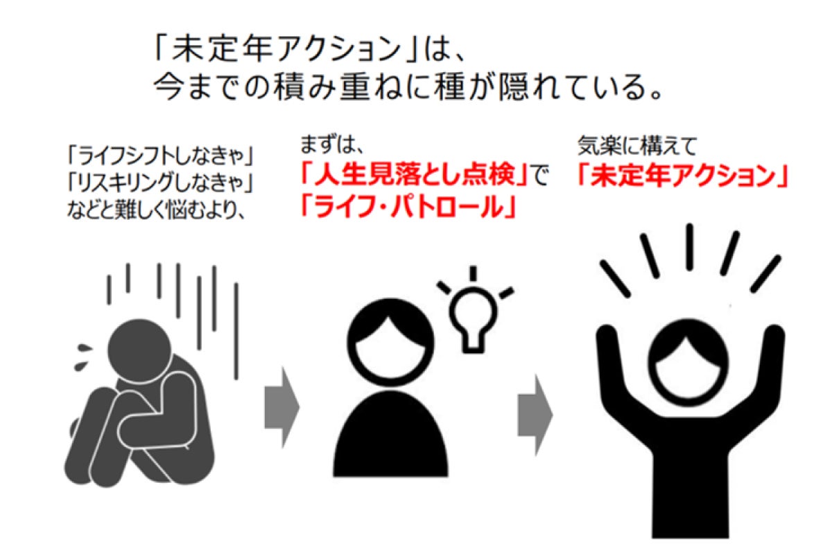 これまでの人生の積み重ねに未定年アクションの種が隠れています。難しく考えて悩むよりも、ごくカジュアルに「人生見落とし点検」というライフ・パトロールをしてみてはいかがでしょうか。過去の自分と今やっていることを振り返って見ると、もしかしたら過去の自分が今の自分を助けてくれるかもしれないし、今いやいややっているようなことも、次のステージの種になるかもしれません。ぜひ気楽に、希望をもって未定年アクションにつなげていただきたいです。そして、自分はどう生きたいかという願望に気づいていただければ幸いです。