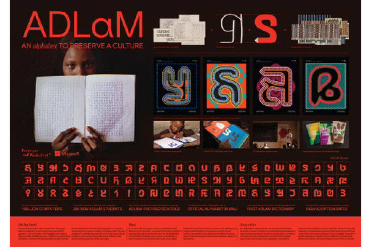 今年のグランプリは、言語文字のデザインの「ADLaM」です。西アフリカのフラニ族は口頭で話すだけで書き文字を持っていません。言語文化が衰退していくことを懸念したバリー兄弟は、手書きのアルファベット「ADLaM」の制作を発想しました。兄弟はMicrosoftの力を借りて、文字をデザインし、デジタル化して、各種デバイスでも使いやすいデジタル書体化することに取り組みました。今後はMicrosoft 365のプログラム群、デスクトップ、モバイルに展開していく予定。デザインとデジタルの力で、文化保存に役立てようという作品です。他のエントリーより、豊かな人間性を持ち、より強いインパクトを創り出していることが評価されました。