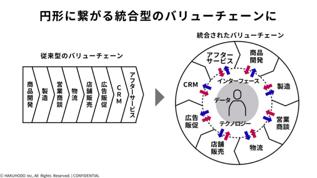 「従来型のバリューチェーン」が商品開発から製造、販売、アフターサービスまで直線的な発想だったのに対して、今後は、共通のデータ基盤を中心に、各バリューチェーンを顧客価値最大化のために最適化していく、「統合された円形のバリューチェーン」で発想することが必要になります。