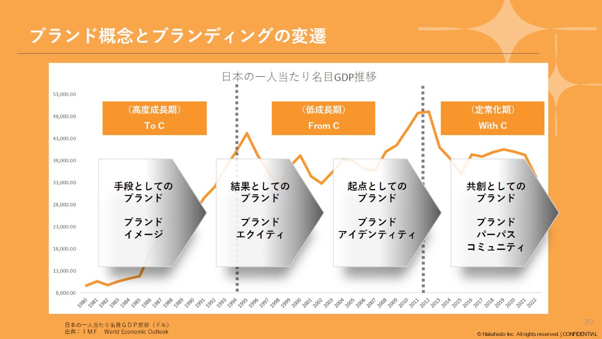このようなマーケティングの変化とともに、近接する領域であるブランドやブランディングに関する考え方も大きく変わっています。高度成長期のブランドの考え方は「to C(カスタマー=顧客)」でした。それが低成長期になると「From C」、すなわちブランディングとは顧客のニーズや思いを起点とした取り組みであると考えられるようになりました。近年では、「With C」、つまりブランドとは顧客とともに創造していくものであるという考え方が主流になりつつあります。