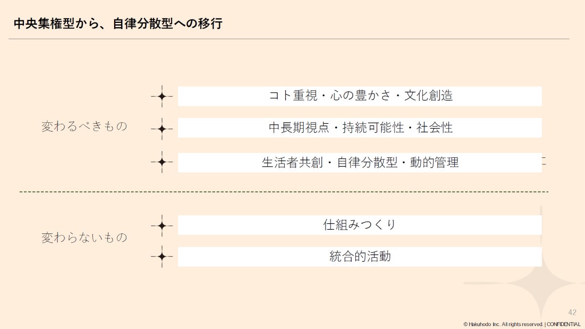 この時代におけるマーケティングでより重視されるのは、心の豊かさや社会性、生活者との共創などです。一方、マーケティングとはさまざまな活動を統合したものであり、仕組みづくりが重要であるという点自体はこれまでと変わらないでしょう。以上がマーケティングの3つ目の潮流「企業から生活者へのパワーシフト」を見る視点です。キーワードは「生活者共創」「自律分散型」「動的管理」です。