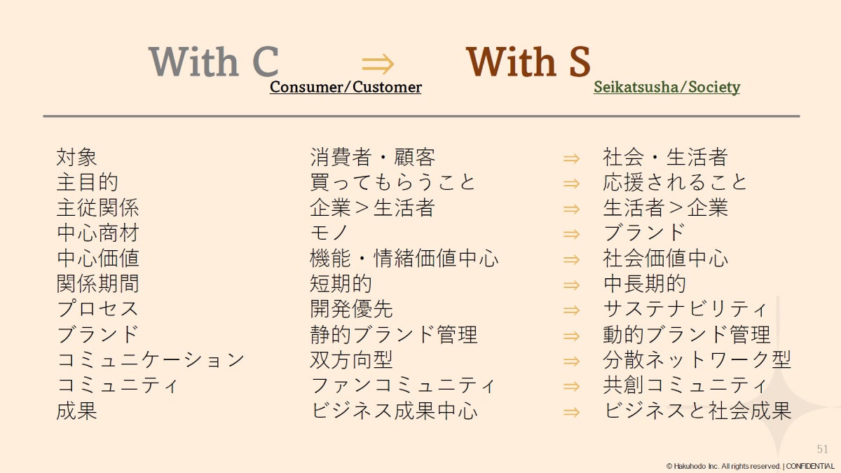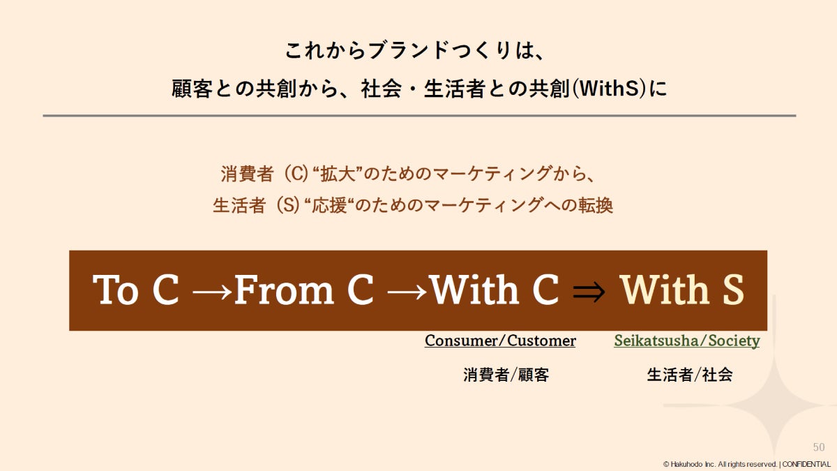 もう1つ、これからのブランドを考える際に必要なのは、ブランディングやマーケティングの対象は「“消費”者ではなく“生活”者である」という視点です。企業の役割は「消費」の創造ではなく、社会における「生活」の創造であり、生活者から「応援」されることによってブランドは成長していく。その考え方を示すのが「With S」という言葉です。Sは生活者や社会(ソサエティ)を表しています。先ほど、「To C」「From C」「With C」というマーケティングの変遷を紹介しました。これからは「With S」がマーケティングの基本的なスタンスになると私は考えています。