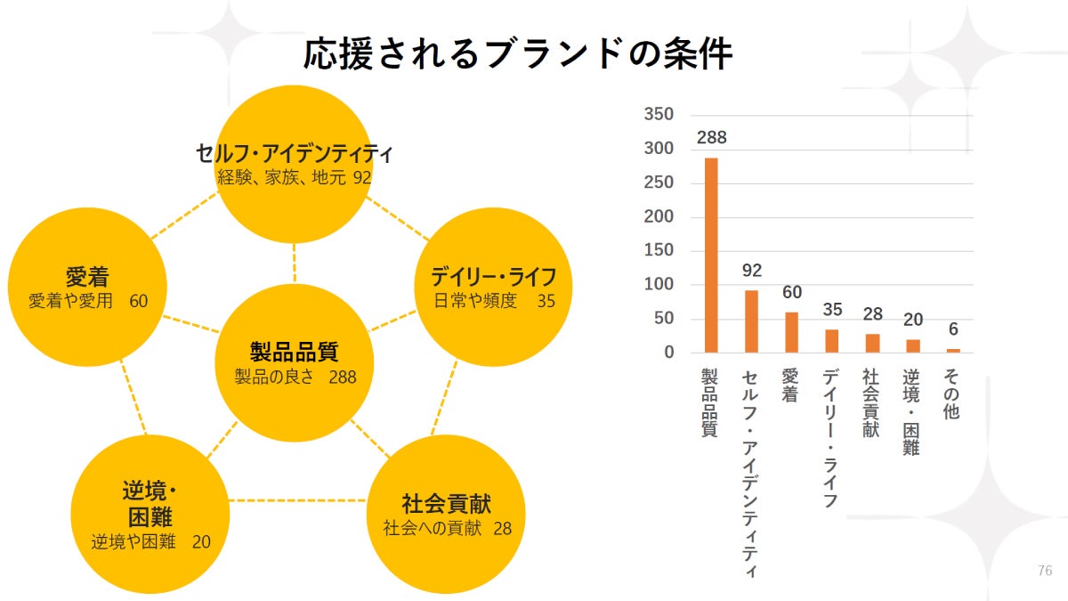 3つ目の調査は、一般の方々302人を対象にしたオンラインアンケートです。応援する企業やブランドを最大3つ挙げてもらい、その理由を記載してもらいました。私たちは、以上の3つの調査結果を集計・分析して、「応援されるブランドの6つの条件」として整理しました。最も重要な条件は「製品品質」です。ほかに、生活者が企業やブランドとのつながりを感じる「セルフ・アイデンティティ」や「愛着」、日常的に利用されている「デイリー・ライフ」といった条件も応援の要素になると考えられます。一方、「社会貢献」「逆境・困難」など、企業のパーパスや経営の姿勢に関わる要素も応援されるために欠かせない条件です。