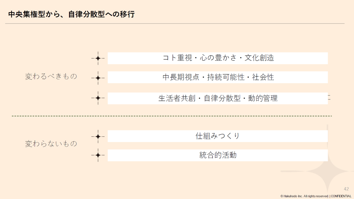 この時代におけるマーケティングでより重視されるのは、心の豊かさや社会性、生活者との共創などです。一方、マーケティングとはさまざまな活動を統合したものであり、仕組みづくりが重要であるという点自体はこれまでと変わらないでしょう。以上がマーケティングの3つ目の潮流「企業から生活者へのパワーシフト」を見る視点です。キーワードは「生活者共創」「自律分散型」「動的管理」です。