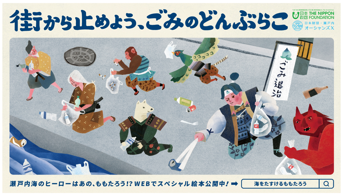 瀬⼾内海に⾯する4県(岡⼭県、広島県、⾹川県、愛媛県)と⽇本財団が共同で進める海洋ごみ対策プロジェクト「瀬戸内オーシャンズX」の認知拡大キャンペーン。制作した絵本が教育機関を通じて子どもたちに配布されたほか、ごみ拾いイベントなどの活動にも「海をたすけるももたろう」のモチーフが活用された。
