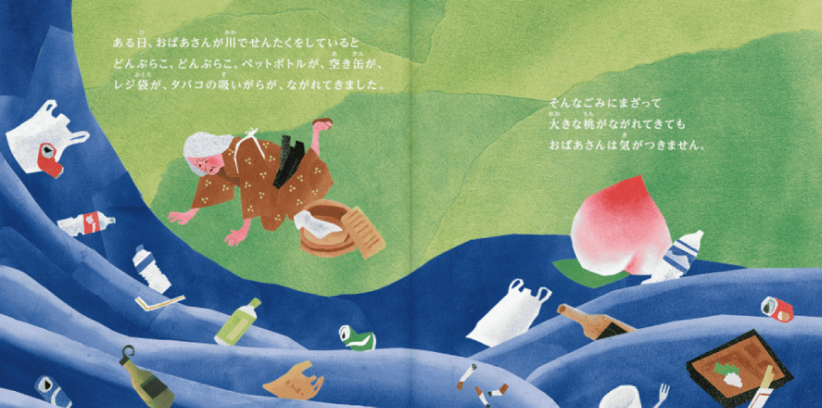 竹内:まずは海洋ごみがどういうものかを調べることからはじめたよね。そのなかで衝撃だったのが、瀬戸内海の海ごみのほとんどが街から生まれているごみ*であるということ。ポイ捨てされたごみやタバコの吸いがらなどが風で飛ばされて川に辿り着き、それが海に流れているというんです。さすがにいま、海に向かってポイ捨てする人っていないじゃないですか。でも海に捨てている意識なく、街から出たごみが海に流れている。それを伝えることが自分ごと化することにつながるんじゃないかと考えて、川から桃が流れてくる桃太郎の話が浮かんだんです。