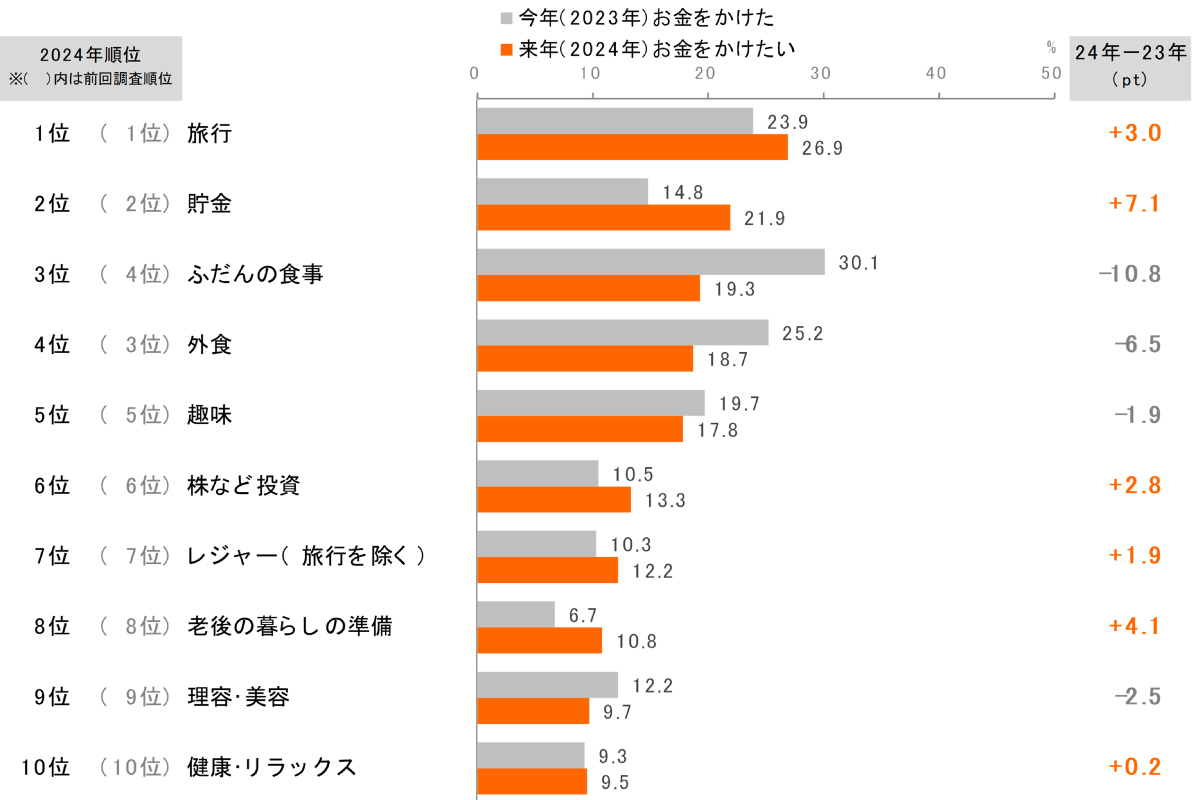 そんな生活者の来年の動向はどうなのでしょうか。年末恒例の調査『生活者にきいた“2024年 生活気分”』の結果をご紹介します。まず生活者が予想する来年の「世の中の景気」をみると、「悪くなる」と答えた人は36.2%で前回(44.9%)から大きく減少したのですが、依然として「良くなる(14.7%)」の2倍以上の水準です(図③)。その理由を自由回答で聞くと、「良くなる」と思う理由に“コロナ禍の沈静化”を挙げる人が多い一方、「悪くなる」と思う理由に“物価上昇”が多く挙がっています(図④)。さらに「来年お金をかけたいもの」を聞いても1位は「旅行」ですが、2位は「貯金」が続いており、ここでも“解放感”と“閉塞感”がない交ぜになった生活者の心理がみてとれます(図⑤)。逆にいうと、この相矛盾する2つの気持ちをうまく止揚させれば、生活者の気持ちをつかむことができるかもしれません。