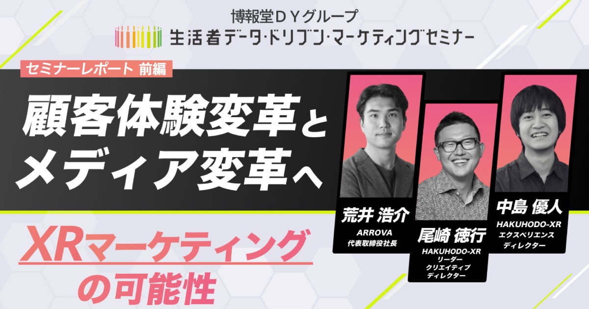 博報堂DYグループが主催する“生活者データ・ドリブン”マーケティングセミナーでは、そんなXR技術のマーケティング領域への活用可能性について、セミナーを実施。今後、XRマーケティングはどのように生活者に新しい価値を創造していくのか。「メディア変革」と「顧客体験変革」の二つを軸に、事例を交えながら解説しました。第一部ではXRを取り巻く環境とマーケティングへの可能性について、第二部では新事業会社ARROVAの取り組みとメディア変革について、第三部では3Dアバターを使用した顧客体験の可能性についてご紹介します。