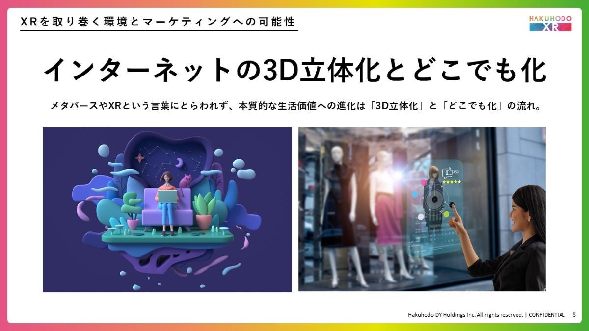 その上で、XRの現在地を考える時に重要なのは、生活者への本質的な価値である「インターネットの“3D立体化”と“どこでも化”」の流れをいかに掴めるかだと考えています。