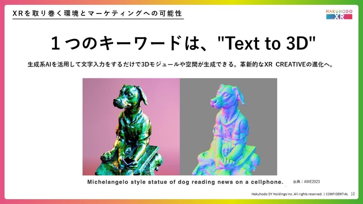 こちらは「携帯電話でニュースを読むミケランジェロ風の犬の像」というテキストから生成された3D画像です。圧倒的なスピードでこうしたオブジェクトを生成し創造性をサポートできれば、表現の幅は飛躍的に拡大していくはずです。