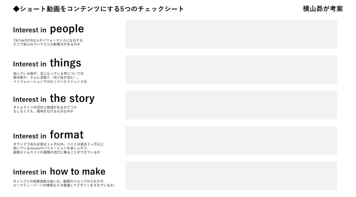 1つ目は、印象に残すために同時に5つの興味を刺激し“コンテンツになる”ということです。たとえ広告であっても、視聴価値のあるコンテンツになることでガードを下げることができ、印象に残りやすい。オリジナルのチェックシートに書き込みながら企画をしています。