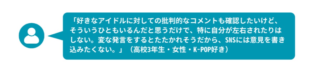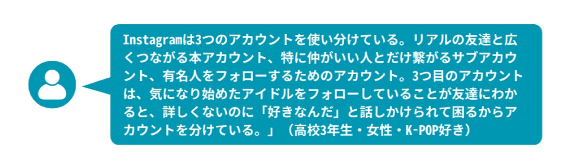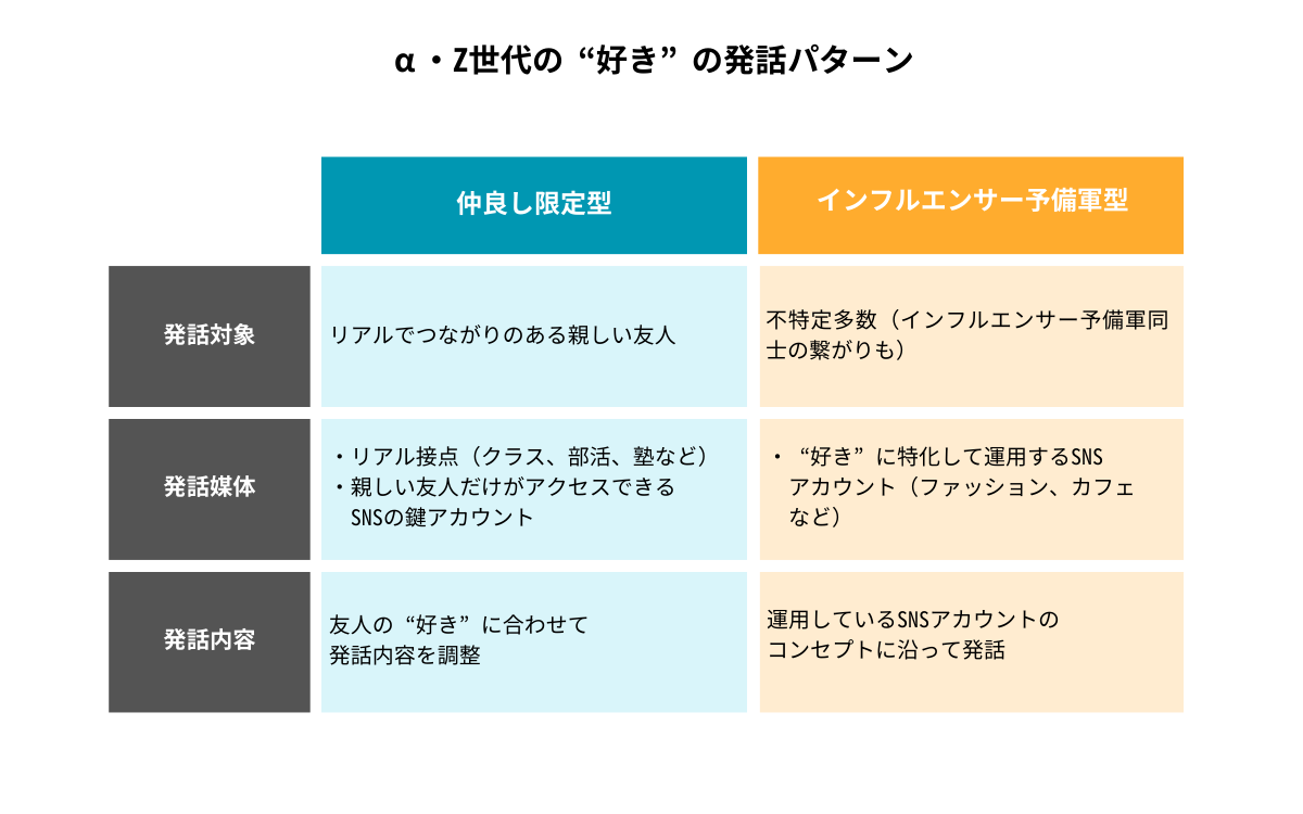 1つめは、リアルで繋がりのある親しい友人に対してのみ発話する“仲良し限定型”。クラスや部活で一緒に遊ぶ友人のなかでも、何でも話せる本当に親しい友人に限定して発話するパターンです。リアル接点での発話はもちろん、複数のSNSアカウントを使い分け、不特定多数が閲覧できるアカウントでは発話せず、本当に親しい友人だけが閲覧できるアカウントのみで発話していました。SNSの炎上リスクを理解しているα・Z世代だからこその発話パターンだと言えます。