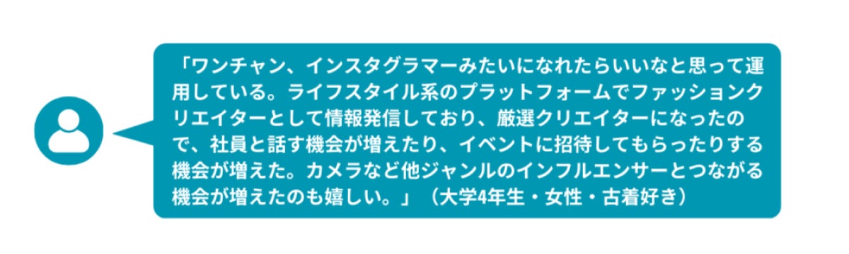 2つめは、α・Z世代には珍しく、SNSでの発話意欲が旺盛な“インフルエンサー予備軍型”。「自分の好きなモノ・コトについて、みんなにも知ってほしい!」「みんなにもやってみてほしい!」といった気持ちが強く、SNSで発話することを楽しんでいるパターンです。“好き”に特化して運用しているアカウントも持っており、フォロワー数を増やすことにも積極的でした。特徴的だったのは、好きなモノ・コトを極めたから発話しているわけではないということ。ハマりはじめた段階でも、いいと思ったら積極的に発話し、むしろ好きを表明することで情報を引き寄せている様子が伺えました。また、人脈形成にも積極的で、様々なジャンルのインフルエンサー予備軍同士で繋がっており、自分の“好き”を発信し合っている様子も伺えました。