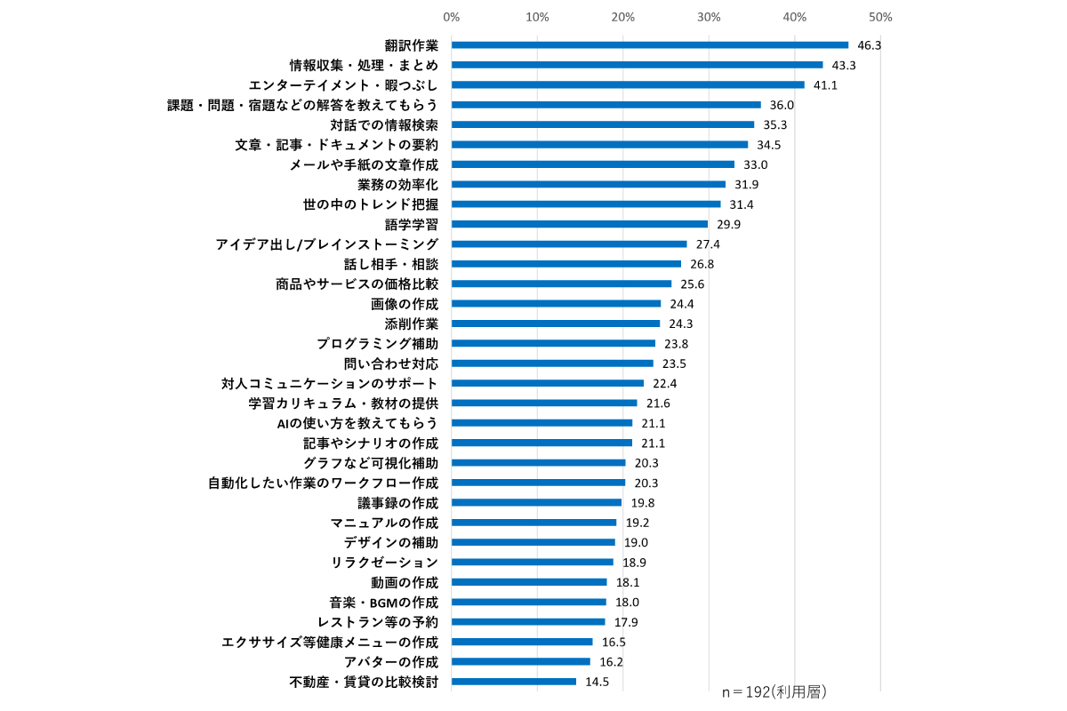 利用層に実際の利用用途を聞いたところ、月1回以上の利用で「翻訳作業」が1位(46.3%)となり、次いで「情報収集・処理・まとめ」(43.3%)、「エンターテイメント・暇つぶし」(41.1%)と続く。5位に「対話での情報検索」(35.3%)、11位に「アイデア出し/ブレインストーミング」(27.4%)、12位に「話し相手・相談」(26.8%)、など生成AIならではの利用用途も多く並んだ。
