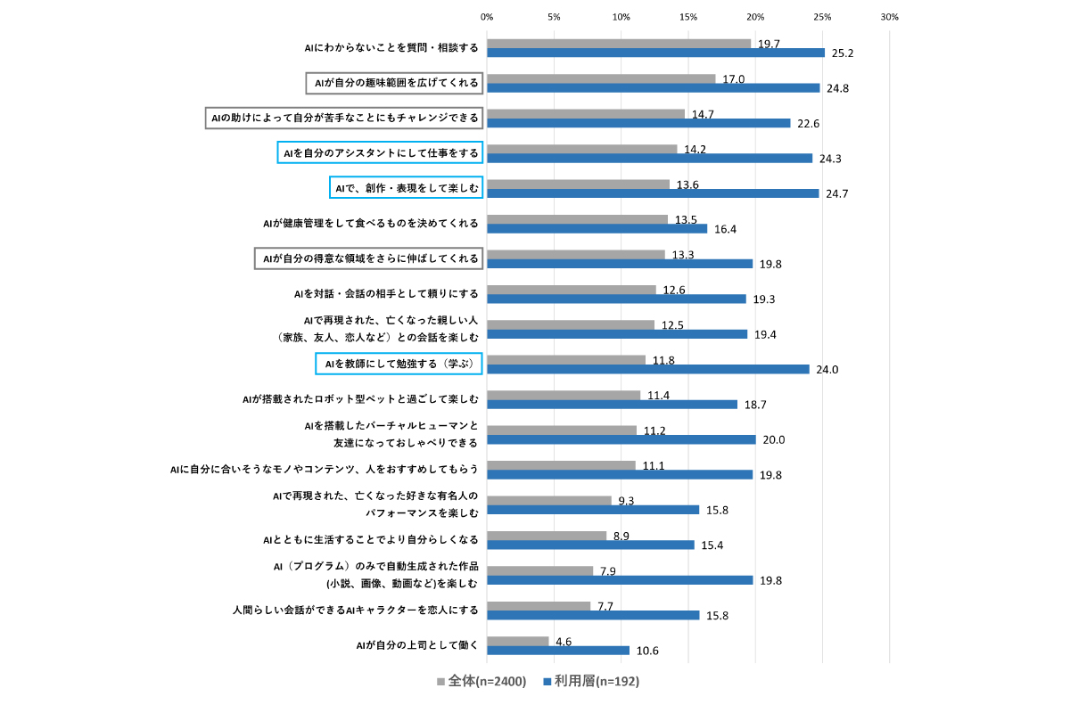 利用層では1位・2 位は全体と同じものの、「AIで、創作・表現をして楽しむ」(24.7%)、「AIを自分のアシスタントにして仕事をする」(24.3%)、「AIを教師にして勉強する(学ぶ)」(24.0%)など、より具体的な目的にAIを活用しようとする回答が上位に並んだ。