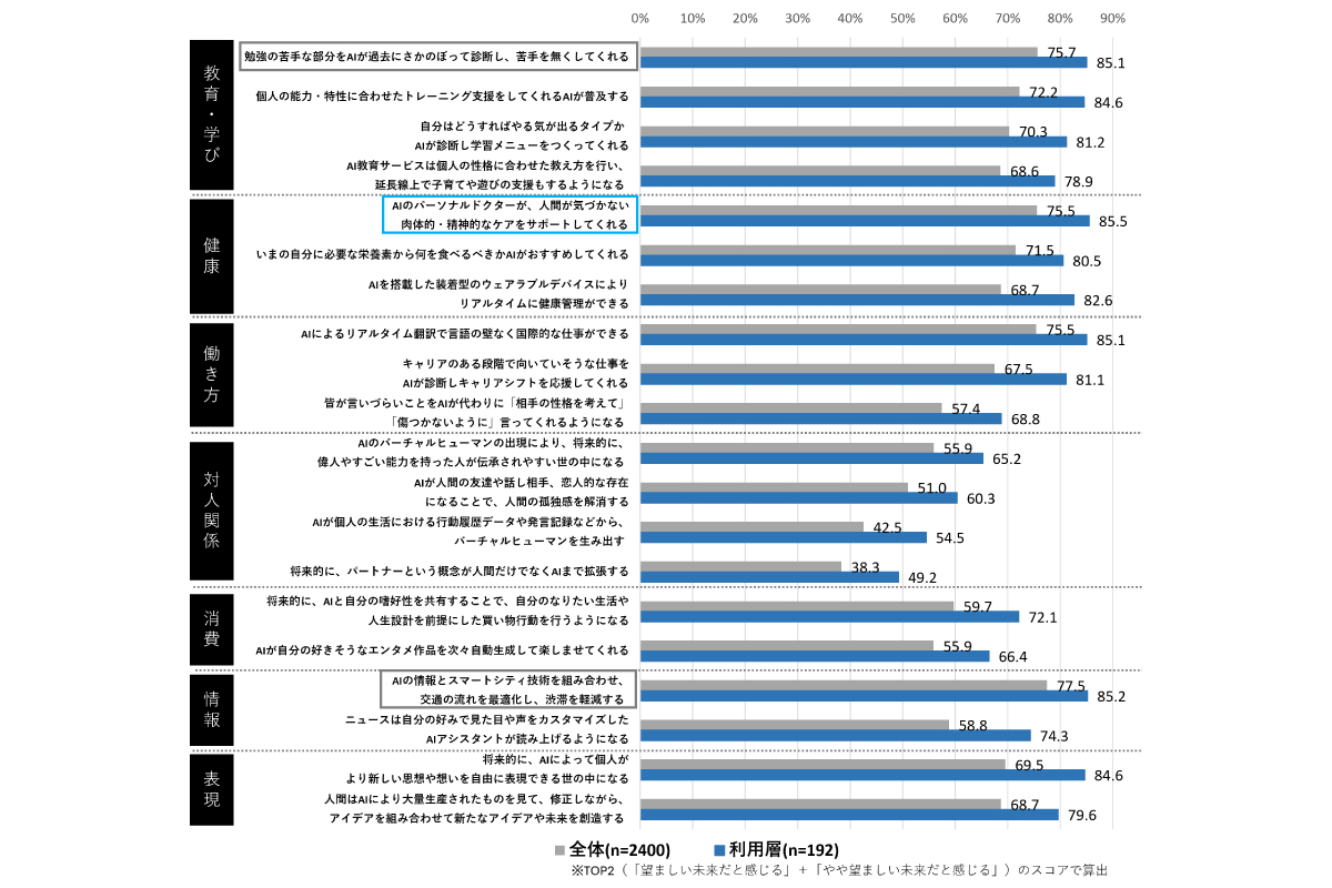 利用層もほぼ同様の傾向だが、全ての項目でAIの未来シナリオの受容度が高い結果となり、「AIのパーソナルドクターが、人間が気づかない肉体的・精神的なケアをサポートしてくれる」(85.5%)が最も支持された。