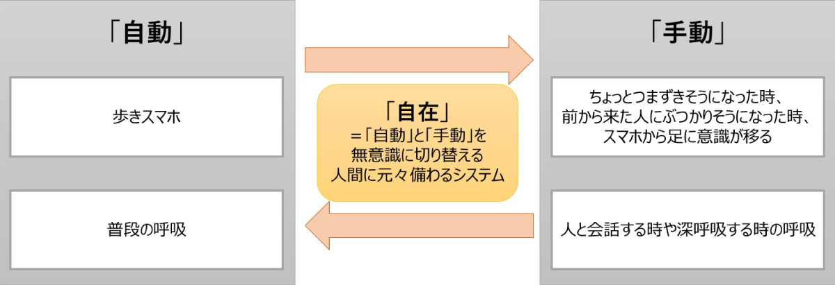 「自在」というのは、「自動」と「手動」を自由自在に変容させることです。例えば、人が歩きスマホをしている時の足はほぼ「自動」です。意識して足を動かしていないですよね。だからスマホに集中できるわけですが、ちょっとつまずきそうになったり前から来た人にぶつかりそうになった時は、足に意識がいって危険を回避しようと一瞬「手動」に戻る。同じように呼吸も「自動」ですが、人と会話する時や深呼吸する時には「手動」にもできる。このように、我々の身体には無意識に「自動」と「手動」を切り替えるシステムが備わっていて、そこに意識というリソースをうまく振り分けることで、ダイナミックに「自動」と「手動」を使い分けることができる。これが「自在」の概念です。