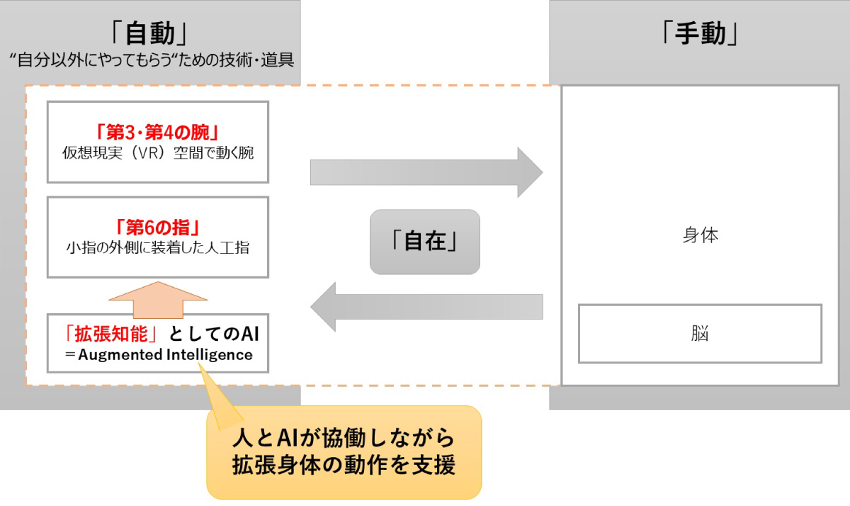 「自在化身体プロジェクト」の研究のひとつである、足先と連動して仮想現実(VR)空間で動く「第3・第4の腕」や、腕の筋肉に取り付けたセンサーによって特定の力を入れた時に得られる電気信号パターンを読み取ることで、小指の外側に装着した人工指を独立制御できる「第6の指」なども興味深いですよね。こういった拡張身体をAIが動かすようになると、今度は人とAIが共有しながら身体を使い、コラボレーションしていくという話になっていくわけです。