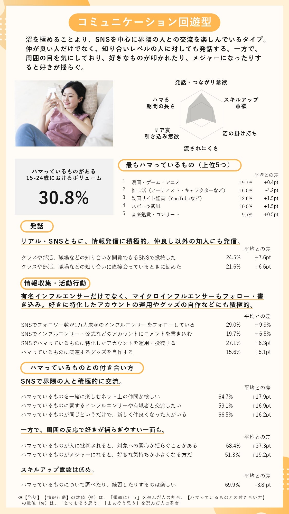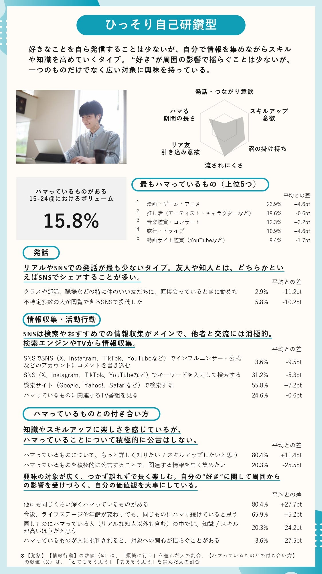 後編では、この「分散型コミュニティ(≒界隈)」の中に、ハマっているものに対してどのようなかかわり方をするタイプがいるのかを探っていきます。今回は、15~24歳の1,000人に対してインターネット調査(※1)を実施し、発話や情報特性、好きなものに対する価値観などの回答から、界隈への参加スタンスに関して似た特徴を持つ人をグルーピングする「クラスター分析」を行いました。