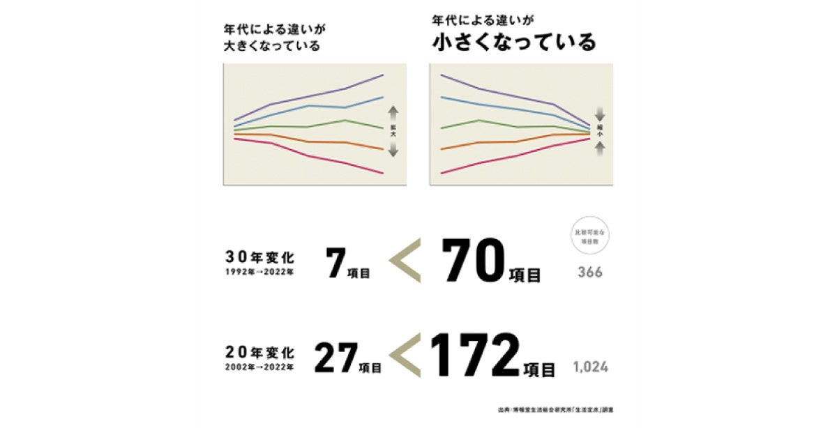 生活総研の元々の分析では、生活定点各項目の年代別回答率について「最高値と最低値の差分が縮まっている」項目に着目して「消齢化」という現象を発見していますね。年代による違いが小さくなっている項目数が、年代による違いが大きくなっている項目数を大幅に上回っていたと。