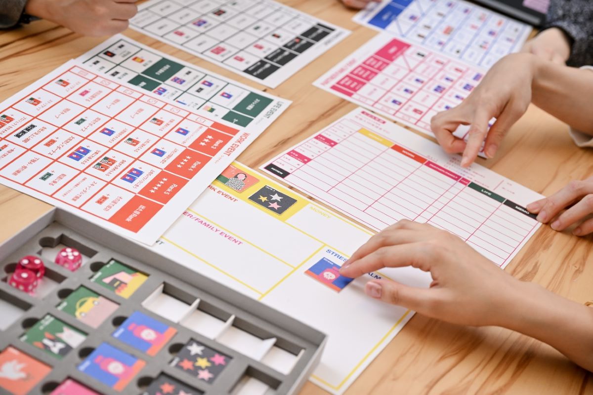 10年分のライフキャリアを疑似体験できるボードゲーム。プレイヤーははじめに10年後の目標を立て、それを達成するため年に一度「ワーク」「パートナー」「ライフイベント」など今年力を入れるべきテーマを設定。サイコロを振りながら、「結婚」「妊娠」「転職」といったさまざまなライフイベントを疑似体験する。