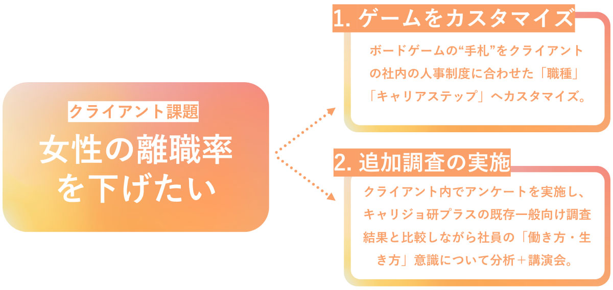 ▲企業研修では、ボードゲームだけでなく、社内の意識調査なども組み合わせて実態把握を行うことで、よりクライアント企業の実態・課題に即したかたちでキャリアデザイン研修を提供。
